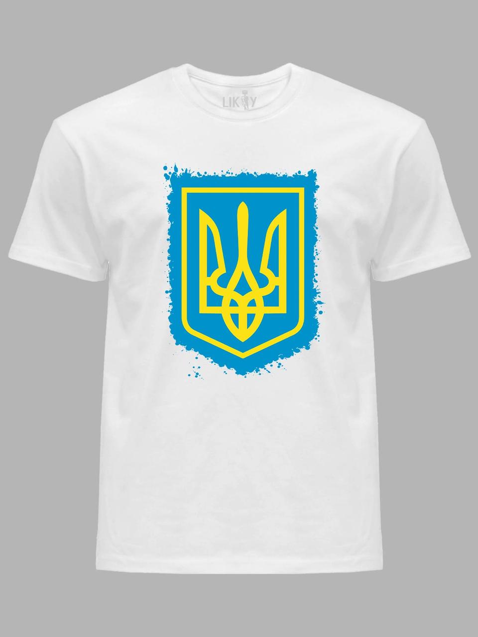 Футболка чоловіча з патріотичним принтом "Жовтий Герб на блакитній фарбі" (220702)